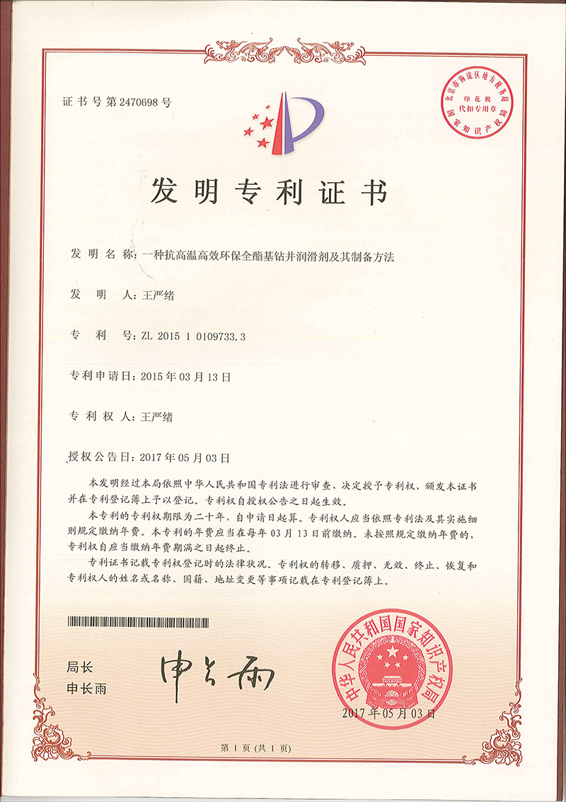 榮譽(yù)資質(zhì) 當(dāng)前位置:首頁(yè) > 榮譽(yù)資質(zhì) > 一種抗高溫高效環(huán)保全酯基鉆井潤(rùn)滑劑及其制備方法