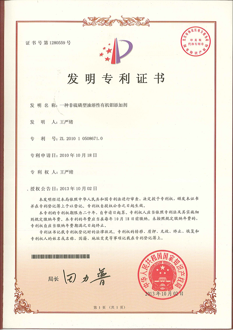 榮譽(yù)資質(zhì) 當(dāng)前位置:首頁 > 榮譽(yù)資質(zhì) > 一種非硫磷型油溶性有機(jī)鉬添加劑